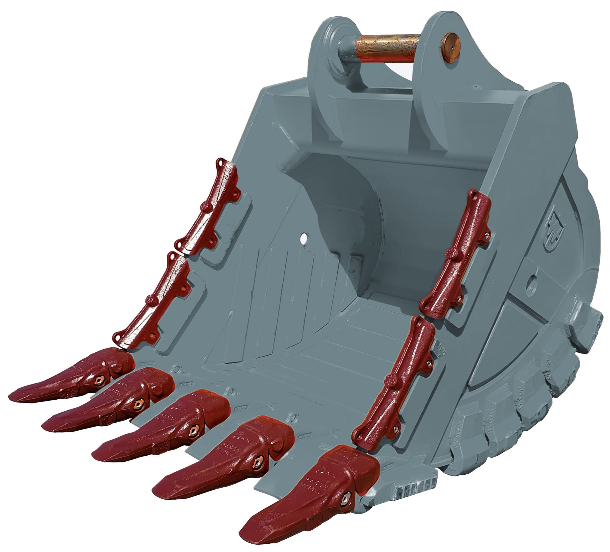 Heavy duty Rock Bucket with the MTG Hammerless Bucket Tooth system, pin on MTG Side Protectors & a full weld on wear protection package fitted.