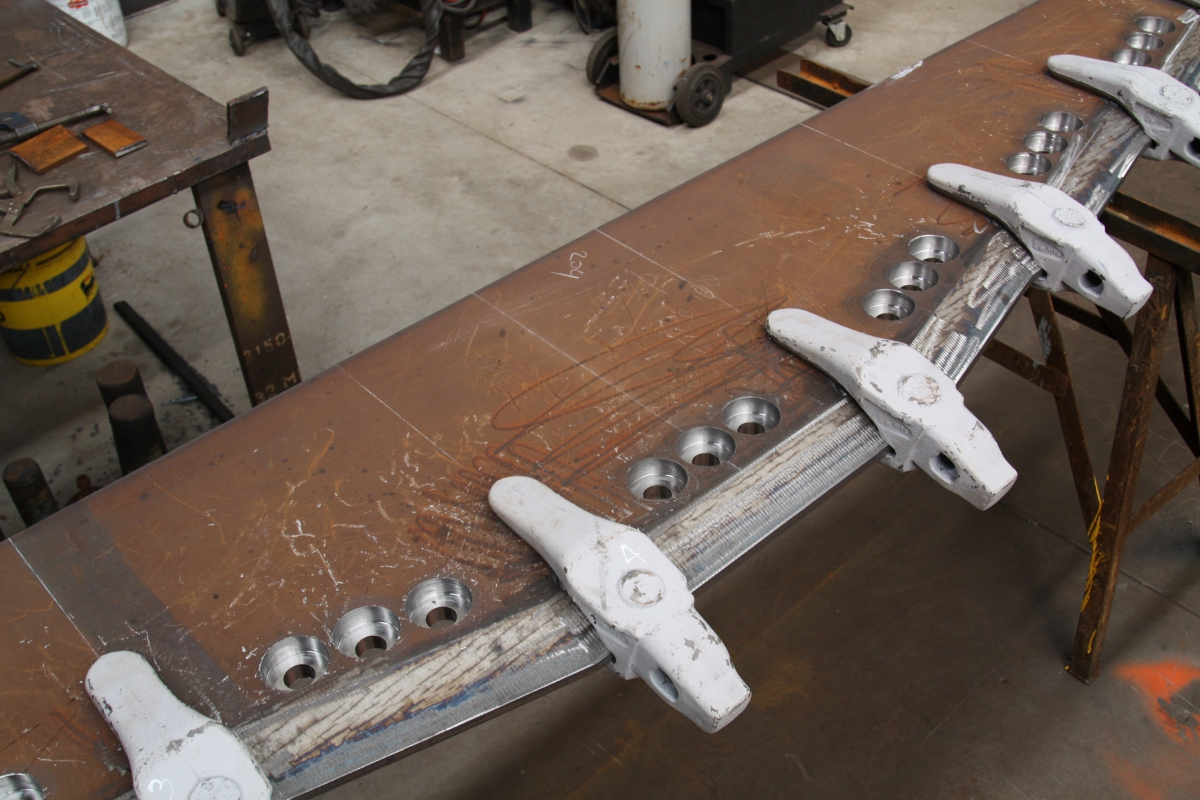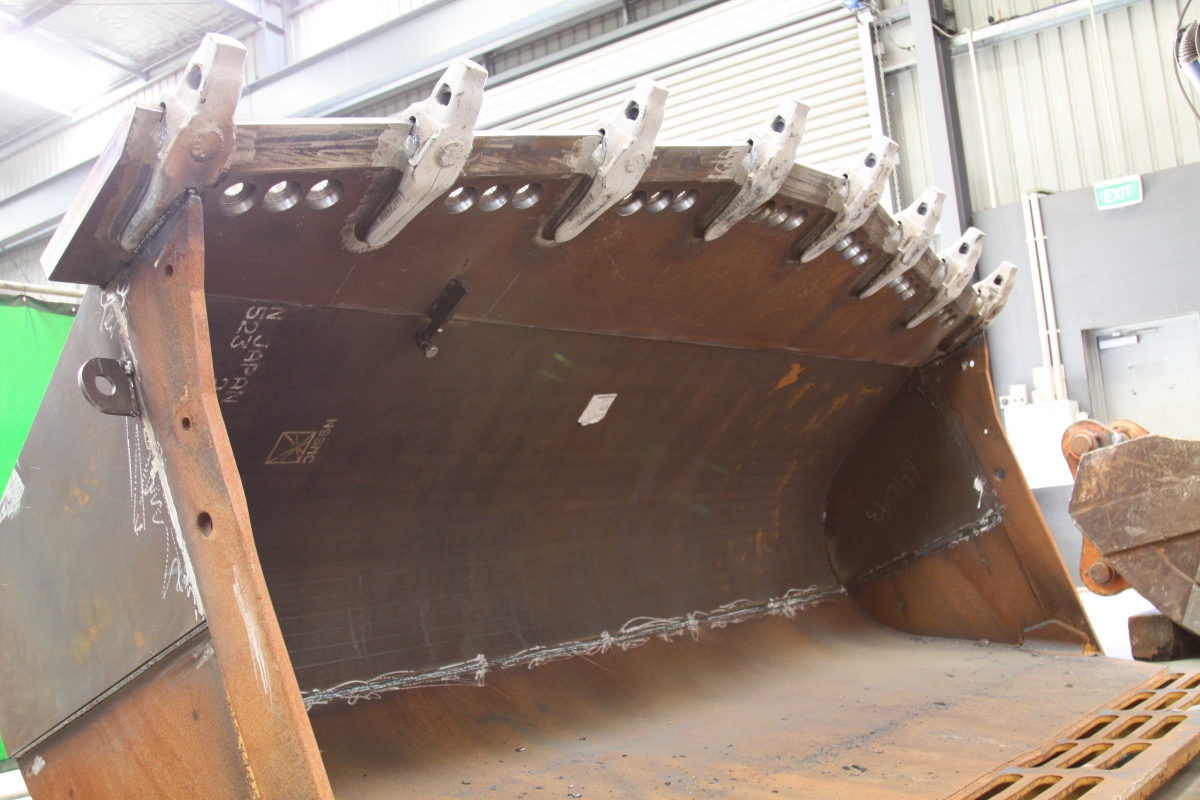 This 2.7 tonne, 4.5m3 rock bucket was rebuilt with a new G450 rolled skin, new side plates, a new G400, 50mm thick drilled, bevelled and counter-bored spade edge with 8x StarMet adapters welded on.