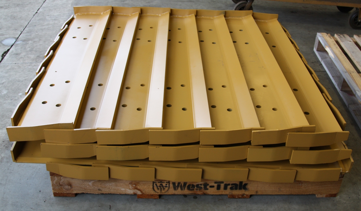 54 of these bolt-on plates were fabricated from G450 Abrasion Resistant Steel for a large Apron Feeder project. These plates bolt between two D9 size track chains and are used to move heavy rocks. The plates were pressed into shape, milled on the back edge, holes drilled to suit the chains and end plates welded on.