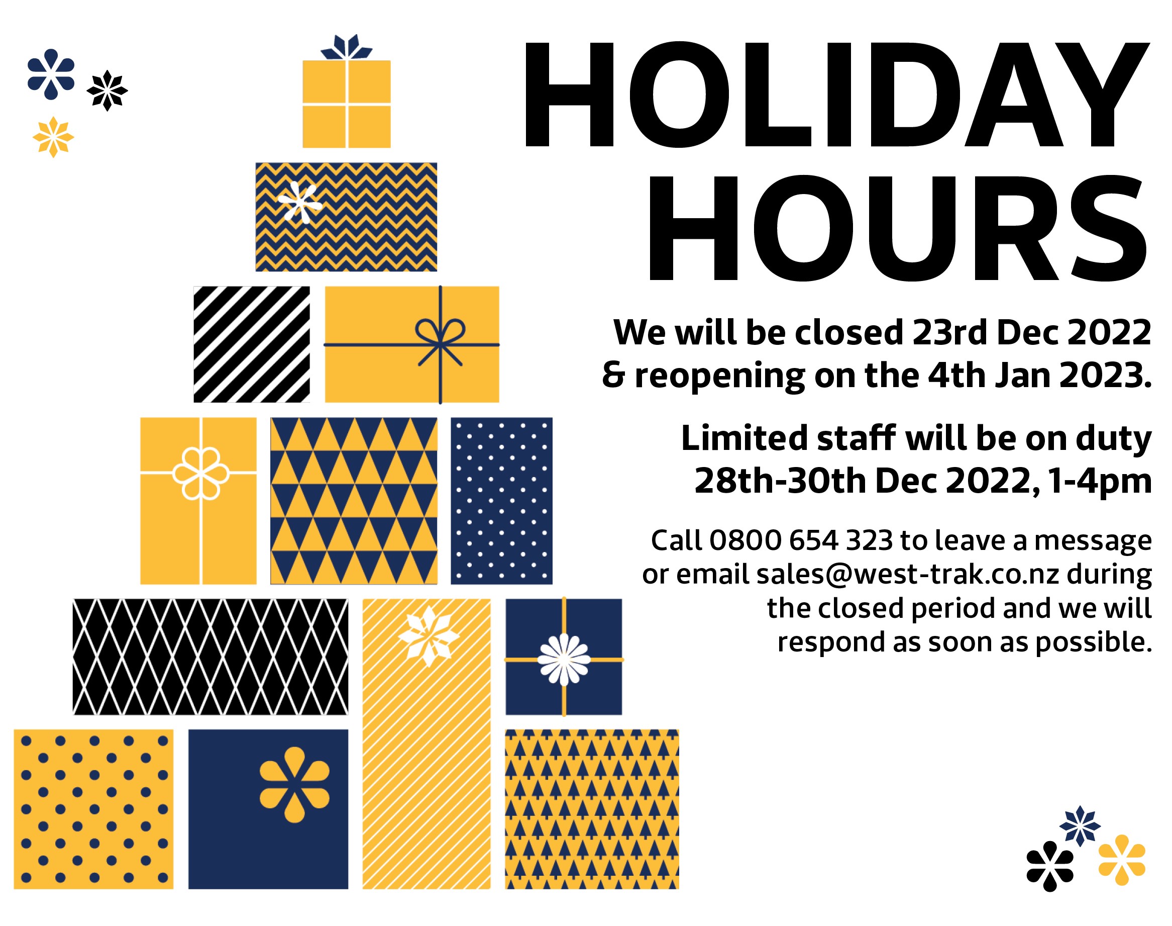 We will be closed 23rd Dec 2022 & reopening on the 4th Jan 2023. Limited staff will be on duty 28th-30th Dec 2022, 1-4pm. Call 0800 654 323 to leave a message or email sales@west-trak.co.nz during the closed period, and we will respond as soon as possible. Thank you to all customers & suppliers for your support throughout this year. We wish you a Merry Christmas & a Happy New Year!